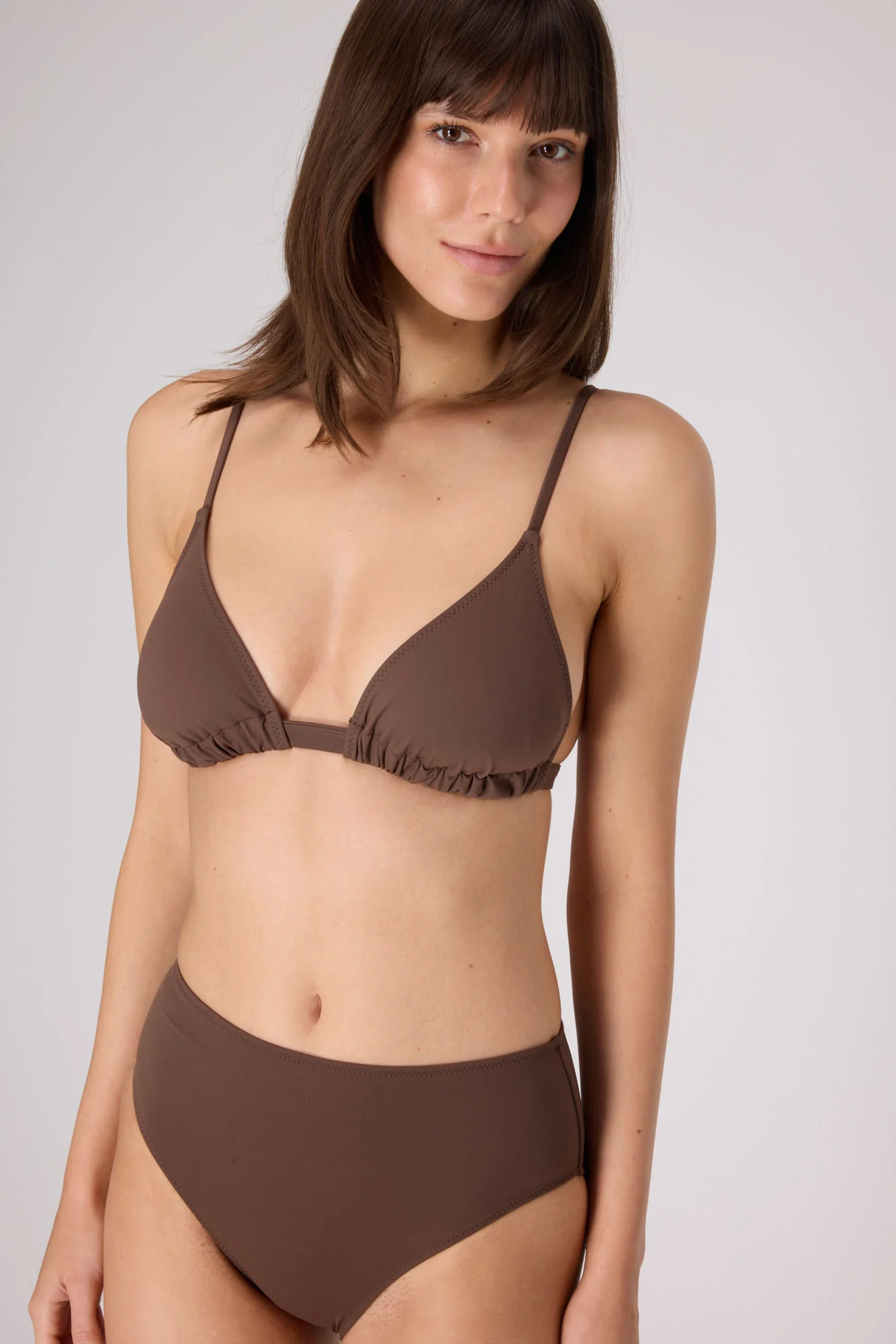Sometimes the simple essentials are the sexiest. Rendered in rich chocolate brown, pared down to its purest elements, and made from sustainable recycled fabric, the Essential Triangle Bikini Top in Choco features clean lines and a flattering, minimalist profile that’s also surprisingly supportive.Â